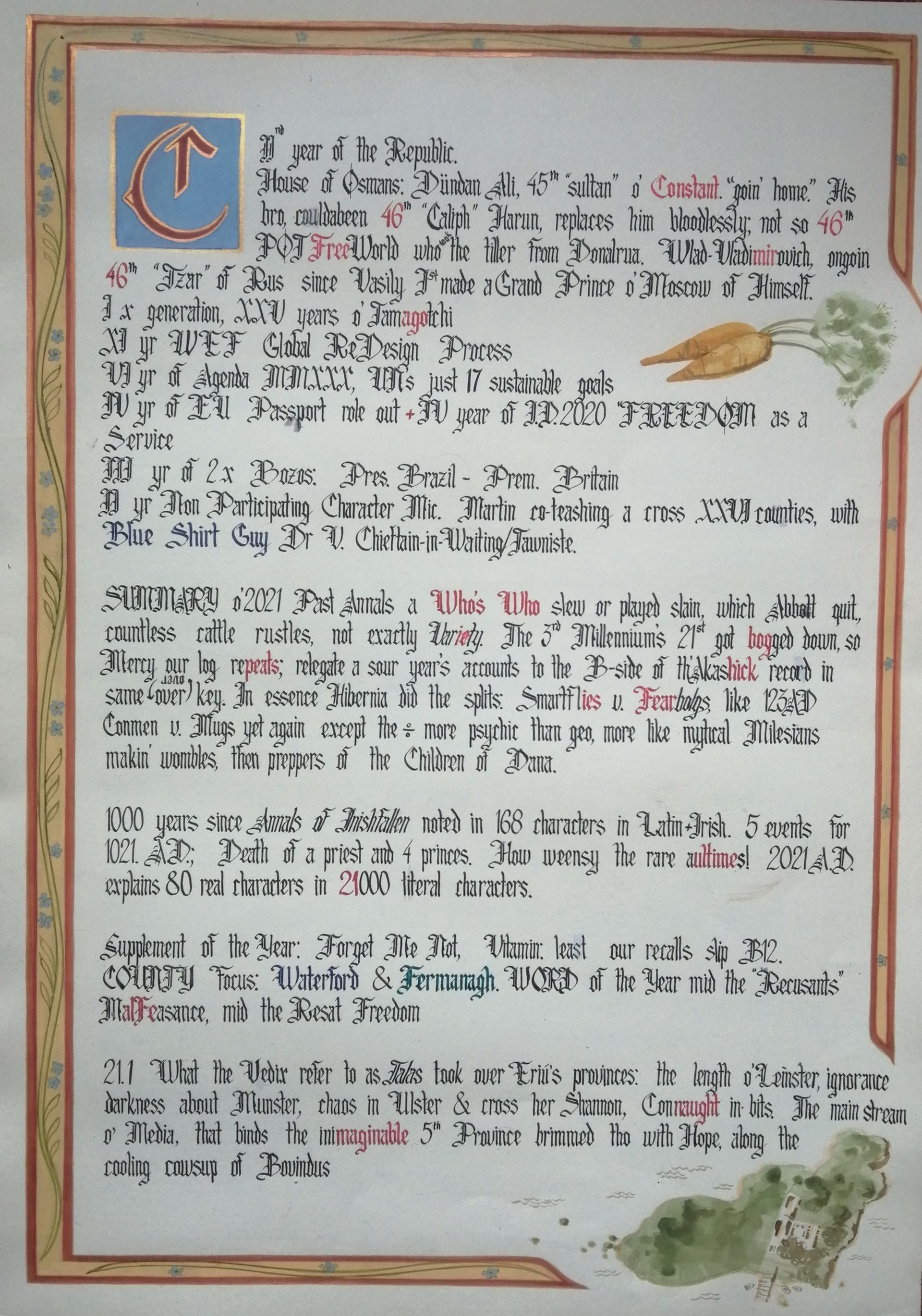 WHY BE BASED IN SLIGO? Though national or international in intent; the names of the places where the Annals were once written are associated with a locality; that can be small like Lecan, Inishfallen, or bigger like Connaught or Ulster, famous like Clonmacnoise & Iona, obscure and no longer in existence like Cluain Eidech & All Saints Island on Lough Ree. There is a diamond shaped zone from Enniscrone to royal Croghan to Lough Erne to Bundoran where most of the entirety of the Irish Annals that survive come from. Our round Scriptorium is in the midst of that jewel.